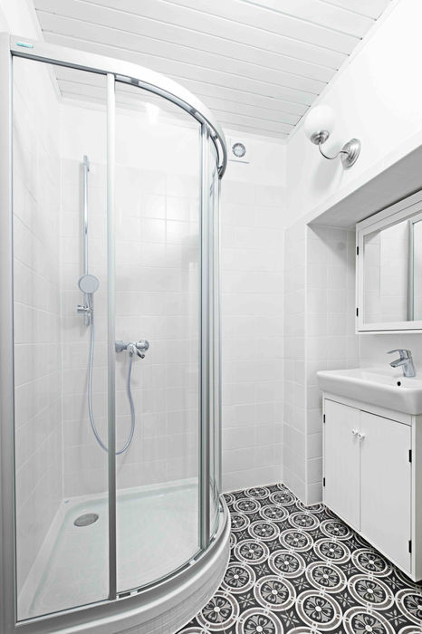 Badezimmer mit großer Dusche, Grohe-Raindance-Duschkopf & Fußbodenheizung
